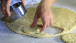 - Rezačem ili velikom čašom izrežite krugove (promer oko 7 cm), a manjom kašičicom ili nožićem izvadite centar svakog kruga da dobijete oblik krofne s rupom.