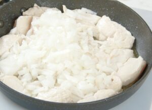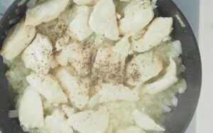 - Iseckajte luk i tikvicu pa ubacite sečenu piletinu u tiganj koju pržite sa obe strane.