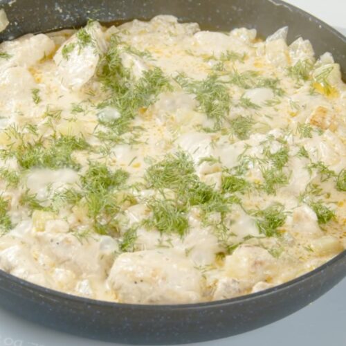 - Umutite kiselu pavlaku sa 2–3 kašike tople tečnosti iz tiganja, pa vratite u tiganj. Po potrebi sipajte 100–200 ml vode ili bujona da dobijete kremast sos.