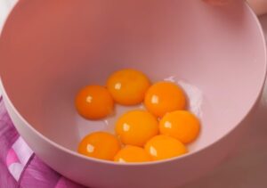 - - Odvojite belanca od žumanaca- Umutite belanca s prstohvatom soli dok ne postanu čvrsta pena.- U drugoj činiji umutite žumanca sa šećerom i vanilin šećerom dok ne posvetle i postanu penasta.